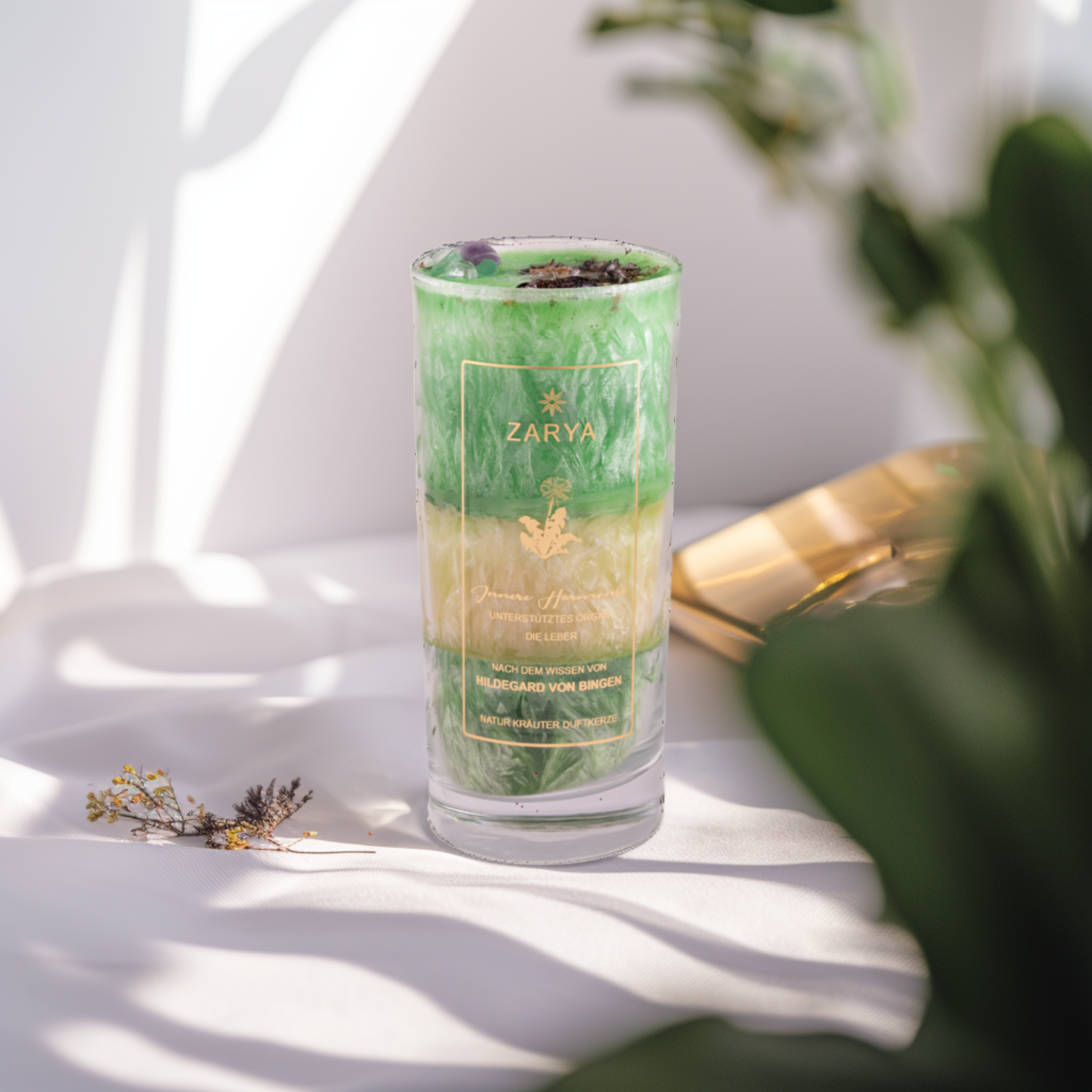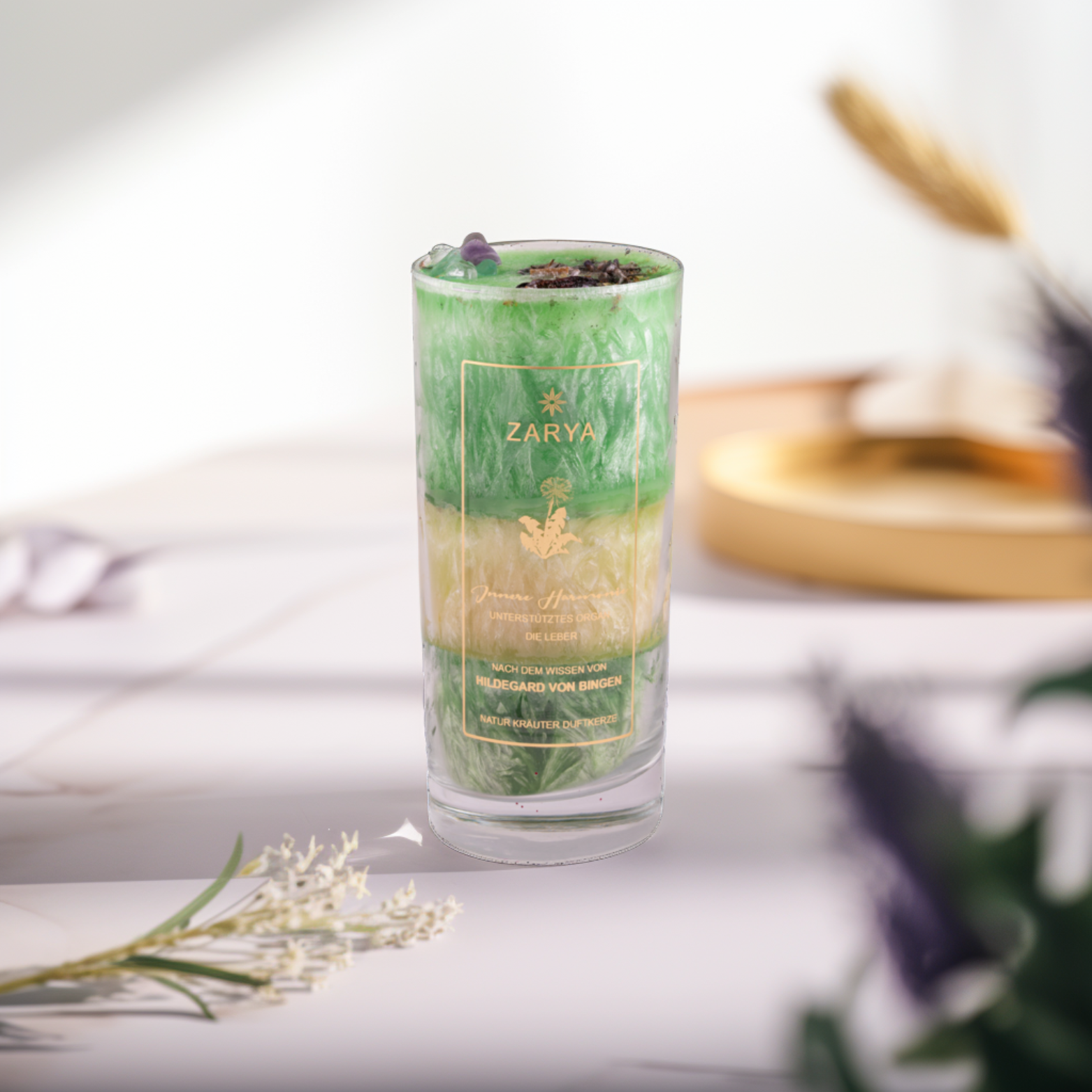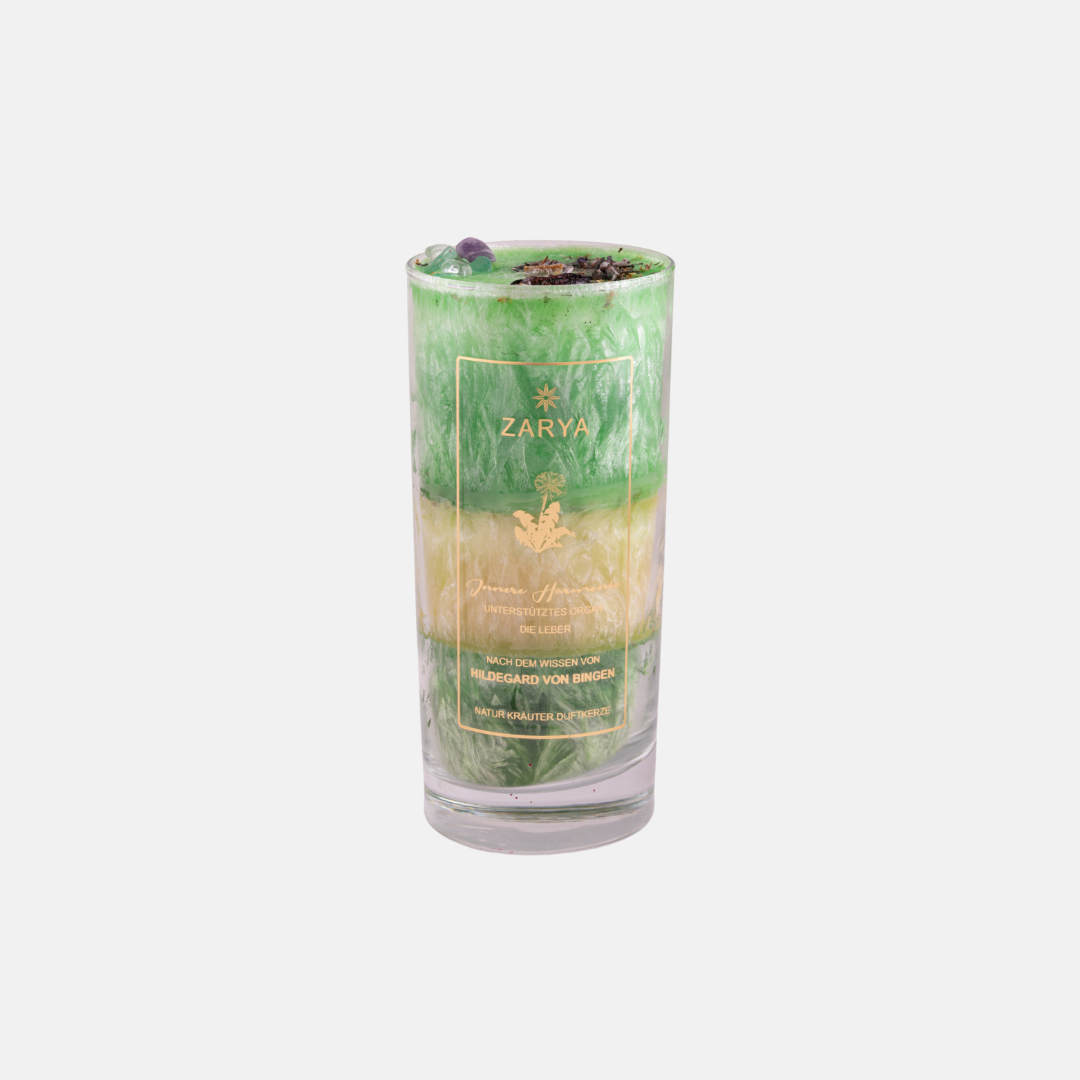In der Kerze befinden sich u. a. grüner Fluorit, Achat und Bergkristall sowie ausgewählte Heilkräuter wie Hibiskus, Mariendistel und Veilchenöl. Sie wird nach Hildegard von Bingens überliefertem Wissen hergestellt und vereint Heilkräuter, Heilsteine und aromatische Pflanzenessenzen. Die Kerze wird mit 100 % naturreinen ätherischen Ölen von Hand gegossen, besteht aus Palmwachs (kbA) und hat eine Brenndauer von ca. 72 Stunden.